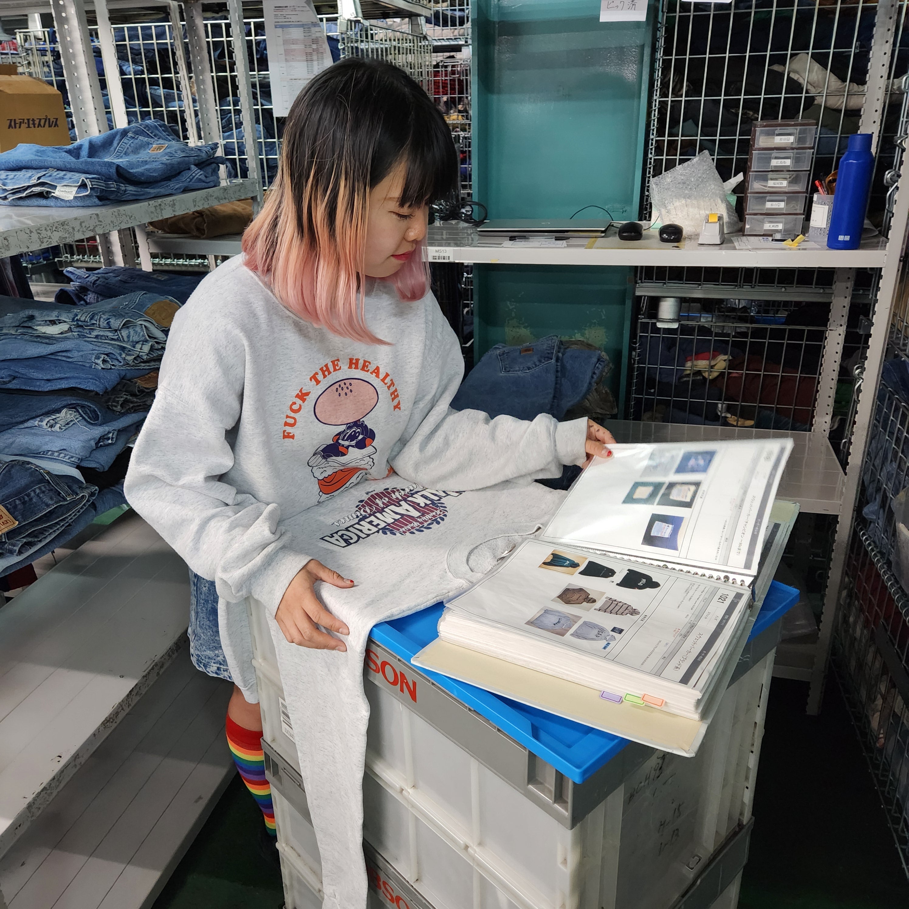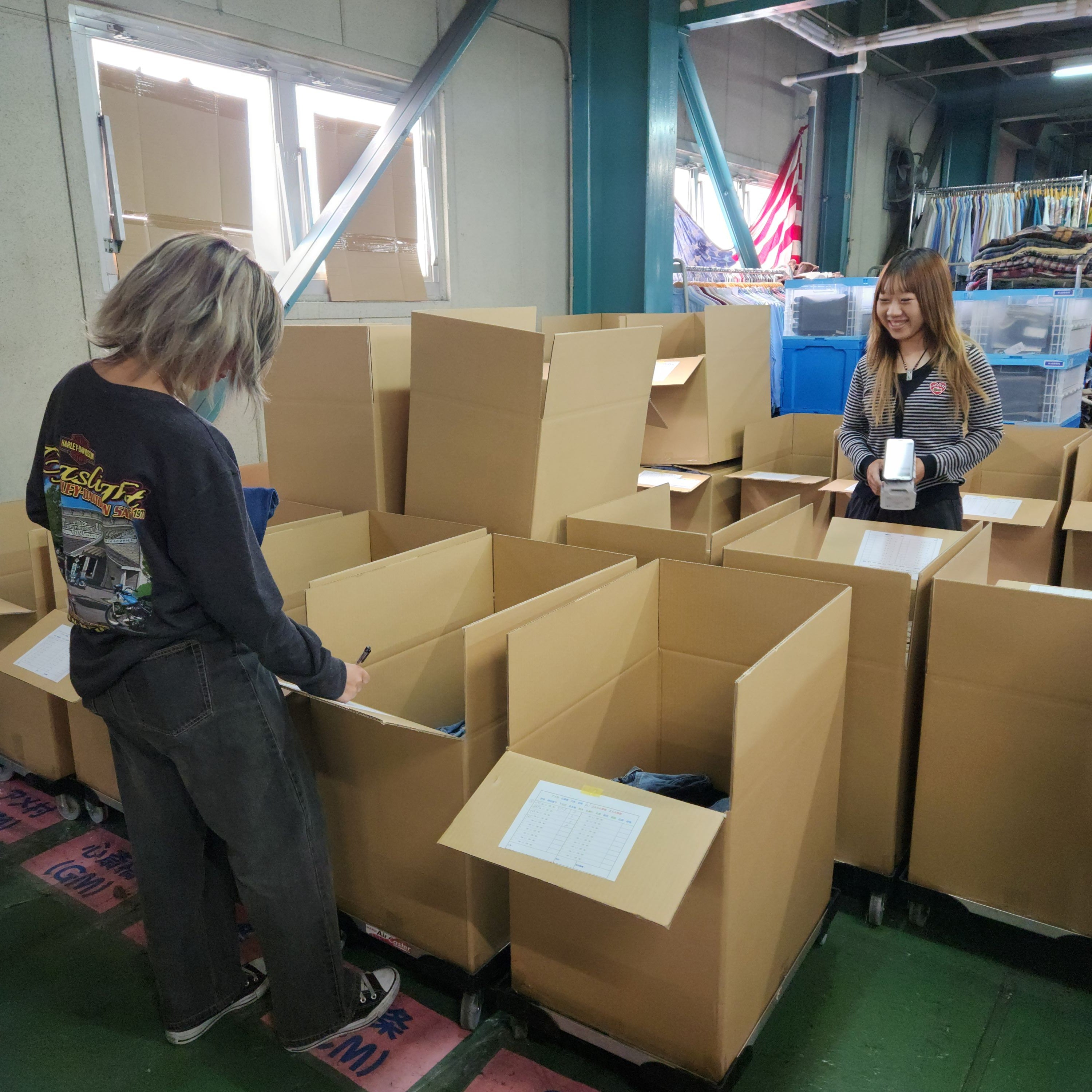 製品課には主にID仕分け、値付け、検品・タグ付け、出荷の4業務あり、実際に契約会社の店頭に置く商品を綺麗な状態で送り込めるように日々準備しています。